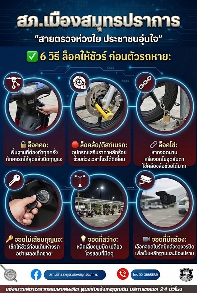 เมื่่อวันที่ (17พ.ย.2568) ฝ่ายสืบสวน สภ.เมืองสมุทรปราการ ได้ร่วมกันจับกุม ผู้ก่อเหตุลักทรัพย์รถจักรยานยนต์ ในฐานความผิด “ลักทรัพย์ในเวลากลางคืน” พร้อมของกลางที่ใช้ในการก่อเหตุหลายรายการฯ อ่านต่อได้ที่นี่